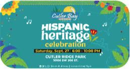 Acompáñenos a una noche de unidad y festividades en honor a las tradiciones hispanas en la 3.ª Celebración Anual de la Herencia Hispana de Cutler Bay, el sábado 27 de septiembre, de 18:00 a 22:00 h, en el Parque Cutler Ridge.